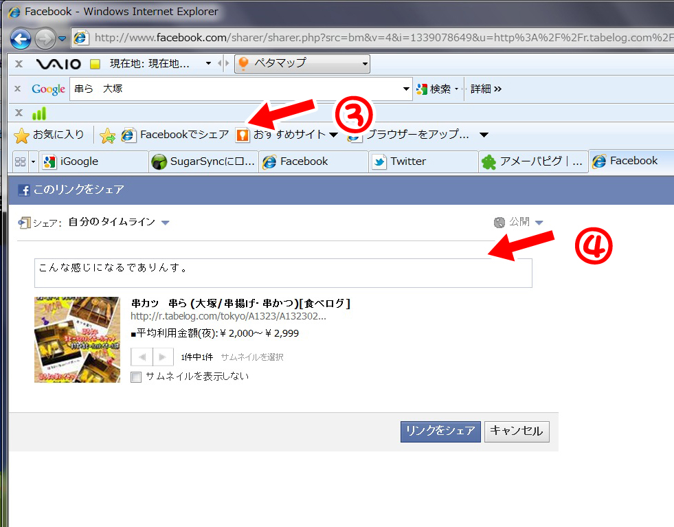 ②上図の画面の説明通りに操作し、ブラウザ上にシェアボタンを作成。